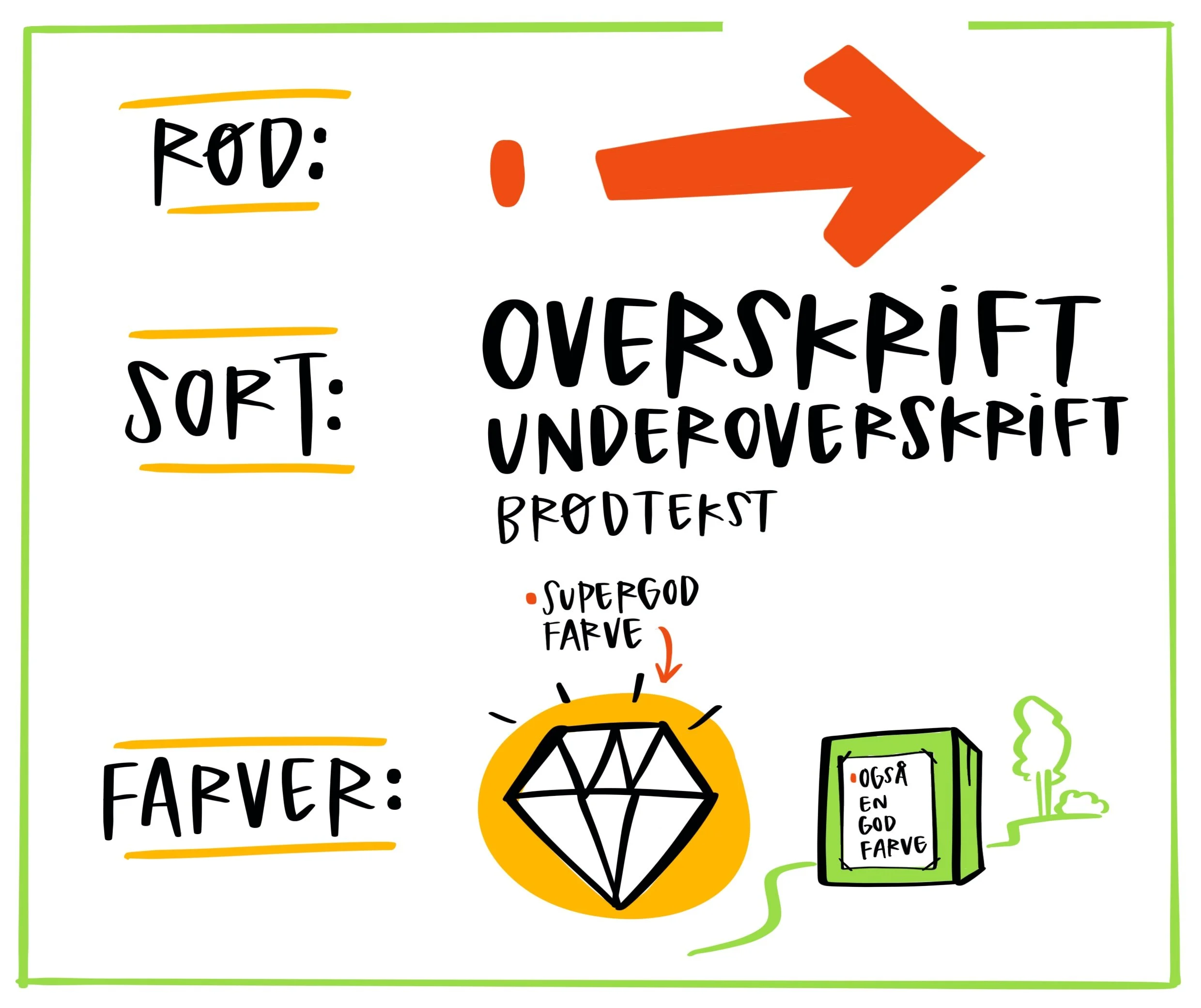 - Tekst = sort (i tre tykkelser: overskrift, underoverskrift, brødtekst)